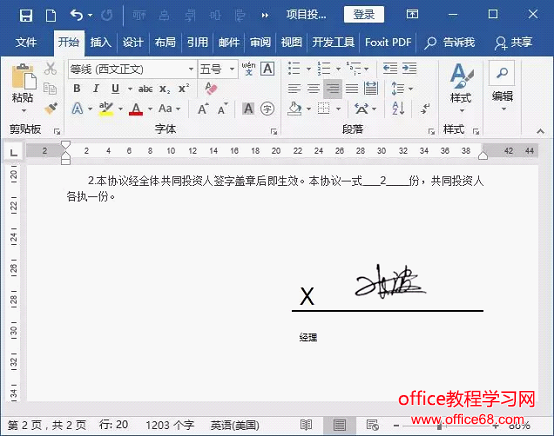 (4)完成上述操作后,单击“签名”按钮即可。此时,即可在文档中显示签名效果,如下图所示。
