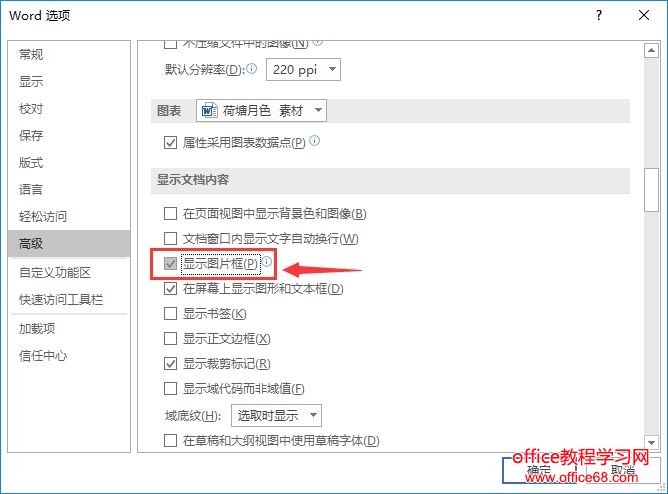 ![]() 点击【文件】-【选项】命令,打开“Word选项”对话框,选择“高级”选项卡,在”显示文档内容“栏中勾选”显示图片框“复选框,单击”确定“按钮。