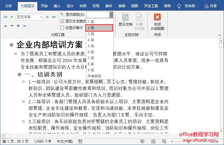 ![]() 步骤三:选择”大纲显示“选项卡,在”显示级别“中设置标题级别,标题样式1就设置1级,标题样式为2,就设置显示2级......。