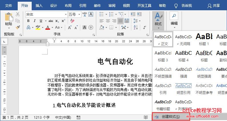 第一步:点击【开始】-【样式】按钮,在弹出的列表框中选择“创建样式”命令。