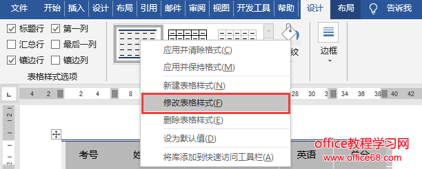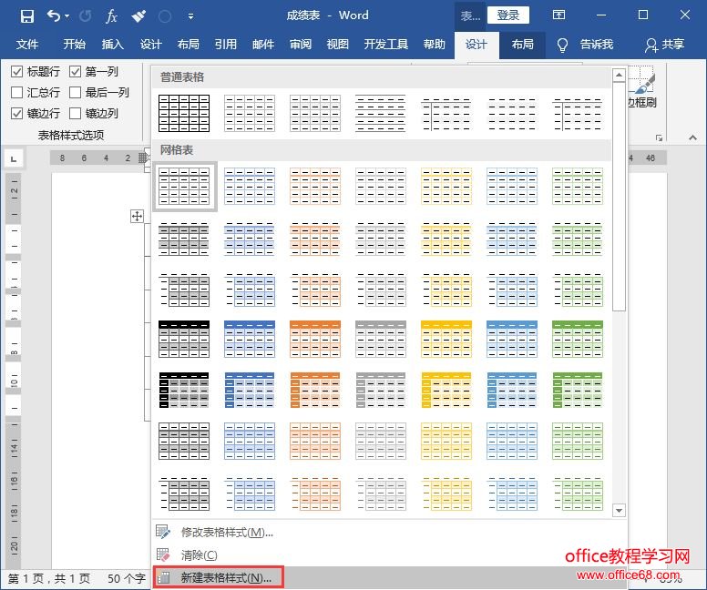 第一步:选择文档中的表格,点击【表格工具】-【设计】选项卡,单击“表格样式”库右侧的下拉按钮,在弹出的菜单中选择“新建表格样式”命令。
