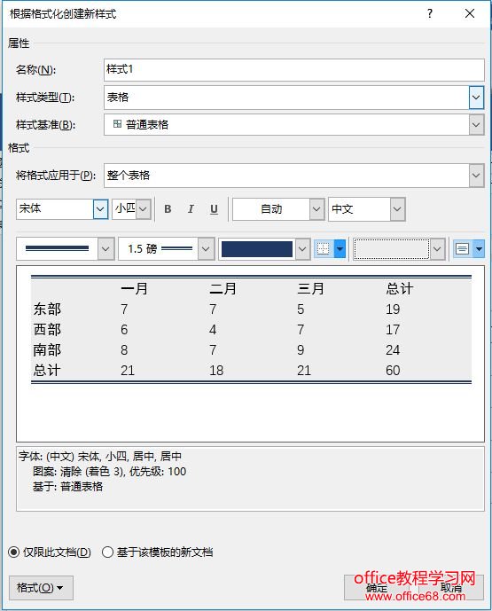![]() 第二步:打开“根据格式化创建新样式”对话框,此时你会发现,“样式类型”栏已默认为“表格”。在“格式”栏中设置表格格式,如,字体、字号、边框、线条样式及颜色等,然后单击“确定”按钮。