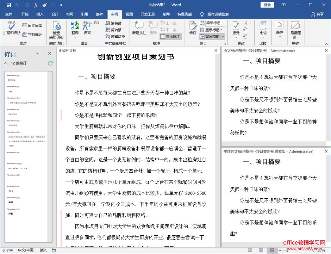 ![]() 此时,会出现一个新文档,新文档左侧则显示具体的修改内容,双击某一项,则可以精确定位到文档中修改的位置点;中间则是比较文档,它通过红色粗线显示修改的大致位置;右侧分别为原文档及修订的文档。