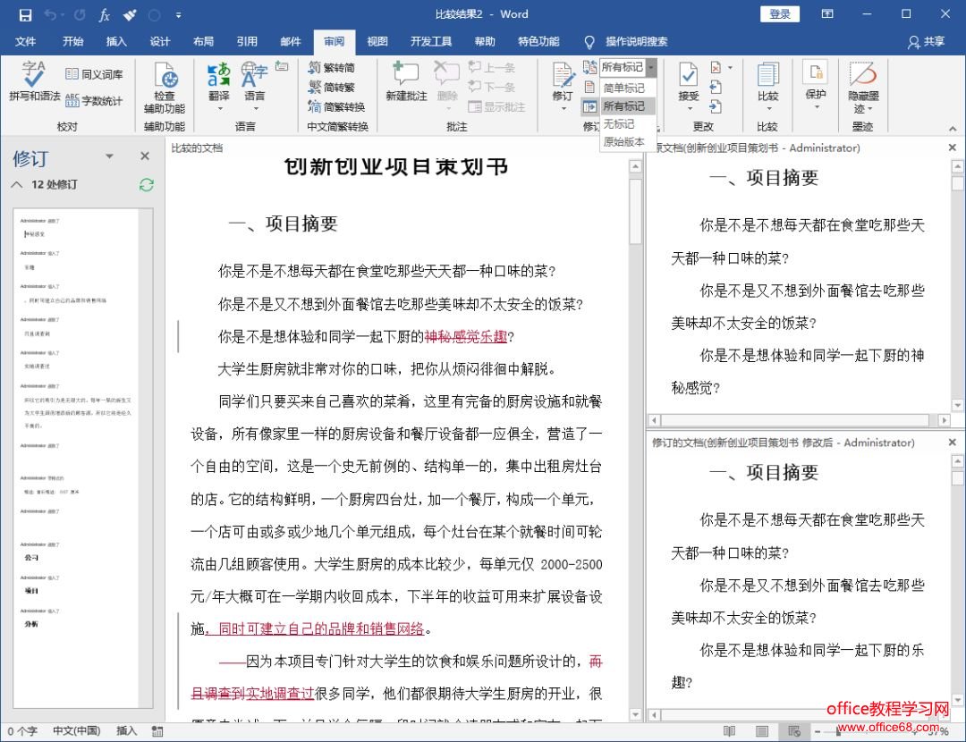 ![]() 技巧提示:在对比模式下,选择【审阅】-【修订】-【所有标记】选择,那么,被修改处内容将以红色标注显示,如下图所示。