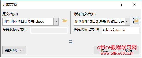 ![]() 打开“比较文档“对话框,然后依次选择需要对比的两个Word文档,设置完毕,点击“确定”按钮。