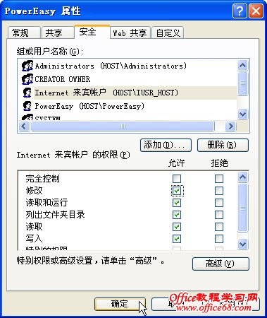B、在您的数据库文件上文件夹上面点击右键-“属性”-“安全”-添加用户:“IUSR_计算机名” 并开放“IUSR_计算机名”的读取、写入权限此方法是目前解决这个问题最好的办法,一般都可以解决问题XP系统下可能点击右键看不到“安全”选项,请先 打开“工具”-“文件夹选项”-“查看”-取消“使用简单文件共享(推荐)” 然后即可在属性中找到“安全”选项。