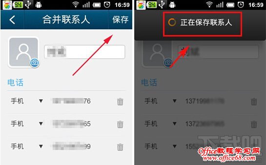 第三步:点击手动合并,出现合并联系人,点击保存,联系人就会出现在同一个界面里。