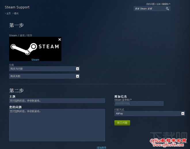 5、登录steam客服账户成功联系客服,出现提问信息填写,根据提问一步一步填写好,填写范例如图所示,付款方式选择AliPay是支付宝。