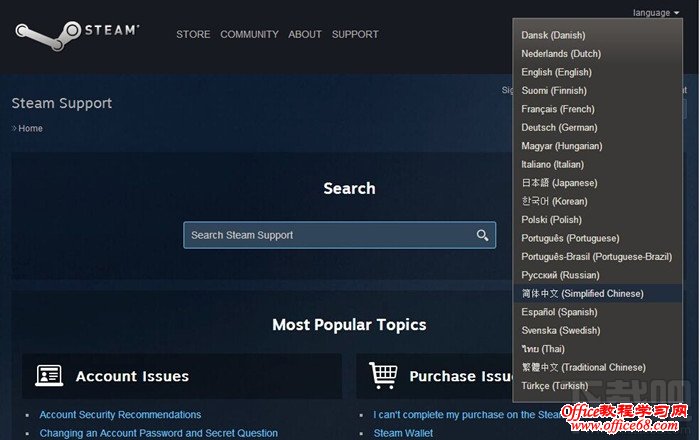 2、弹出steam support网站,并选择适合的language(语言),steam support已支持简体中文。