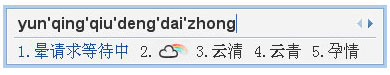 QQ拼音自造字QQ拼音自造字,解决电脑字库中不包含的字无法录入的问题。只需开启QQ拼音自造字功能,电脑字库中不包含的生僻字就都可以输入并显示出来。更多信息,可以查看QQ拼音自造字功能说明 云输入智能模式QQ拼音4.0版本结合云输入,智能获取云结果,让输入更精准。QQ拼音云输入功能是默认开启的。云输入的结果展示在候选框的第二位。 开启云输入功能,输入过程中输入法会智能判断是否需要进行云请求。 云请求发起后,请求中会显示为一朵飘着彩虹的云。效果如下:
