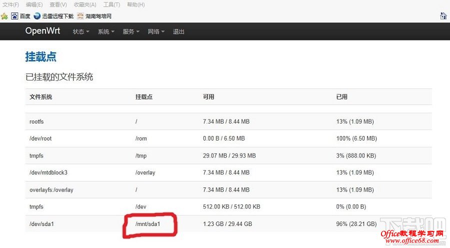 系统-挂载点。 查看U盘或是移动硬盘挂载成功没有。现在一般都安装好了自动挂载。主要是记住U盘的挂载点。安装迅雷远程和文件共享时要用到。