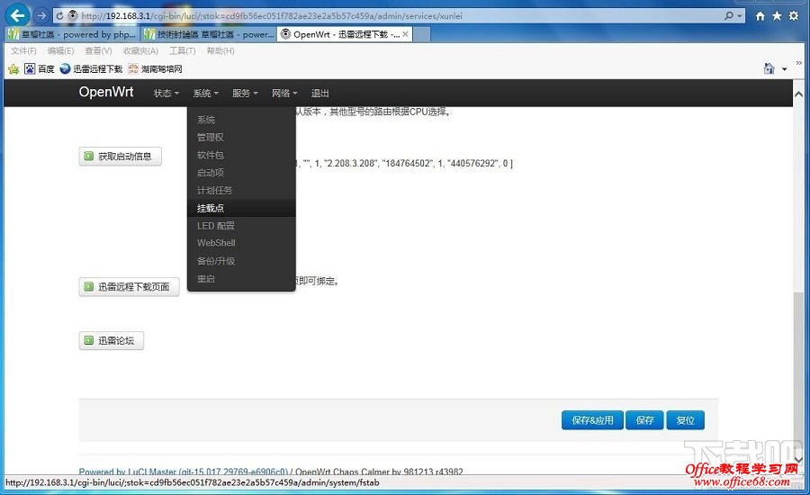 点击保存&应用,程序会安装到你挂载的U盘上去。稍等一会,点“获取启动信息”按钮,激活码会马上显示出来。将你的邀请激活码复制下来,点“讯雷远程下载页面”按钮,填入你的码就能绑定你的路由器了(必须登陆你的讯雷账号,可以是免费账号,是将你的路由器绑定你的讯雷账号!!)