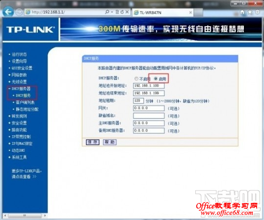 6、进入DHCP服务器界面,设置动态IP,启动路由器的DHCP功能启动。