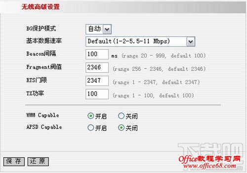BG保护模式:有利于较慢的11b/g无线客户端在复杂的多种模式下能顺利连接到11n无线网络,默认为“自动”。 基本数据速率:根据实际需要,调整无线基本传输速率。默认值为1-2-5.5-11Mbps。建议不要更改默认值。 Beacon间隔:设置AP发送Beacon包频率,一般来说,时间设置越小,无线客户端接入的速度越快,时间设置越大,有助于无线网络数据传输效能提高,默认值为100,建议不要更改默认值。 Fragment阈值:设定一个分片阈值,一旦无线数据包超过这个阈值将其分成多个片段,片段的大小和分片阈值,默认值为2346,建议不要更改默认值。 RTS阈值:RTS(Requesttosend),当数据包的大小超过这个阈值时,使用CTS/RTS机制,降低发生冲突的可能性。在存在干扰长距离客户端接入情况下,可以设置相对较小的RTS值,在一般Soho办公场所建议不要更改默认值,否则会影响AP性能。 TX功率:该项用来设置无线发射功率等级。默认值为100。 WMM-Capable:开启时可以提高无线多媒体数据传输性能(如:视频或在线播放),如果您对WMM不熟悉,请设置为开启。 ASPDCapable:自动省电模式,默认为关闭。 tenda无线路由器设置的全过程就为你介绍完了,每个方面的设置都有图示作参考,你可以按部就班的试操作一下,相信不会很困难。 |