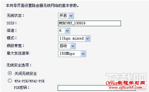 第八步:点击下一步后出现: 无线状态:开启或者关闭路由器的无线功能。 SSID:设置任意一个字符串来标识无线网络,这个可以自己命名。 信道:设置路由器的无线信号频段,推荐选择自动。 关闭无线安全:关闭无线安全功能,即不对路由器的无线网络进行加密,此时其他人均可以加入该无线网络。 WPA-PSK/WPA2-PSK:路由器无线网络的加密方式,如果选择了该项,请在PSK密码中输入密码,密码要求为8-63 个ASCII 字符或8-64 个16 进制字符。 不修改无线安全设置:选择该项,则无线安全选项中将保持上次设置的参数。如果从未更改过无线安全设置,则选择该项后,将保持出厂默认设置关闭无线安全。