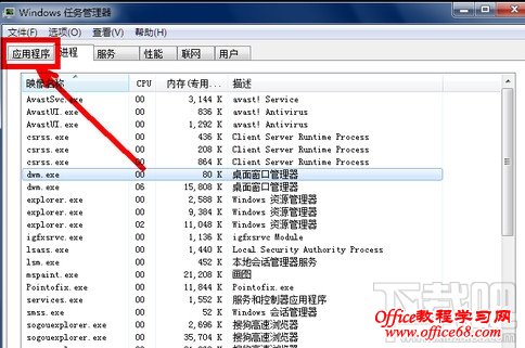 3、点击任务管理器的左上角的应用程序选项。