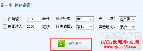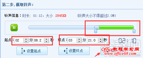 第四步,拉动起点的位置(就是歌曲的开头在哪里开始播放)和拉动终点的位置(歌曲结束的位置),然后试听铃声。做好了后,点击保存铃声。步骤如图: