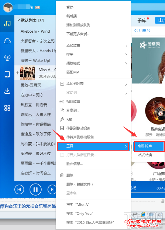 第一步,打开酷狗,右键歌曲选择工具,制造铃声!
