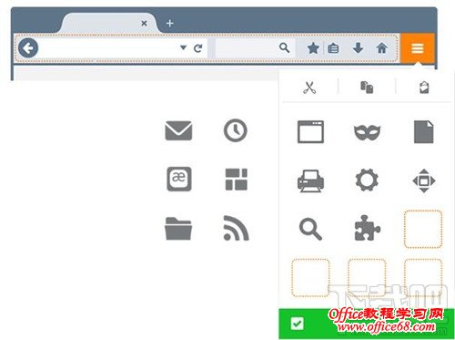 4、新版火狐中,彻底重新设计了自定义浏览器界面的交互体验,操作更简单方便。在新版火狐浏览器的界面上,移除了底部的附加组件栏,同时火狐为用户提供了一个全新的菜单面板,可以快速方便的在这里找到所有用户需要的功能。点击菜单面板最下方的“自定制”,用户将进入到自定义面板,在这里你可以通过直接拖拽按钮,自由的添加、移动、删除你要调整的按钮。确保那些你常用的功能(附加组件、隐私浏览、同步等等)一键即可进入; 5、通过火狐同步功能,你可以实现电脑和移动设备的火狐之间的无缝同步,包括你的浏览历史、密码、书签、和打开的标签页等。 现在,你可以随时终止在电脑上的上网冲浪,将当前打开的标签页同步到手机或 pad 的火狐中,这样即便离开了当前使用的电脑,也可以毫无改变的继续当前浏览;
