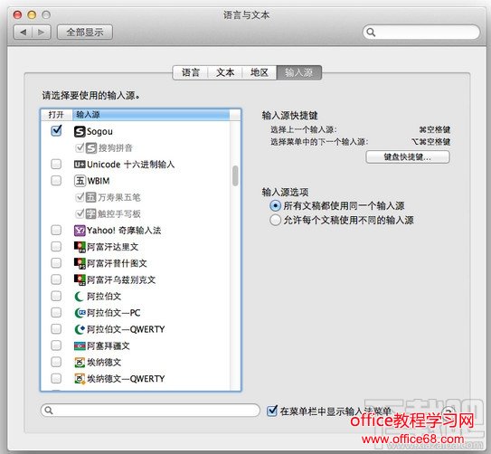 安装完成后,需要注销并重新登录系统账户,如果您此时有重要工作,可以把窗口最小化,待方便时再注销。 三、启用搜狗输入法 for Mac 大多数情况下,搜狗输入法 for Mac 安装后即可立即使用(输入法菜单或cmd+space切换)。如果您不能切换出搜狗输入法,请参考以下步骤。 点击桌面左上角苹果图标打开菜单,点击系统偏好设置,在系统偏好设置窗口点击“语言与文本-输入源”,在左侧列表找到Sogou-搜狗拼音,打钩选中(可以在底部输入框输入sogou快速查找),同时选中“在菜单栏中显示输入法菜单”,可以设置“键盘快捷键”为cmd+space选择上一个输入源。
