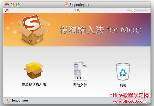双击搜狗输入法 for Mac 安装包(sogou_mac_xxx.dmg),在打开的窗口中有三个图标:安装搜狗输入法、帮助文件、卸载