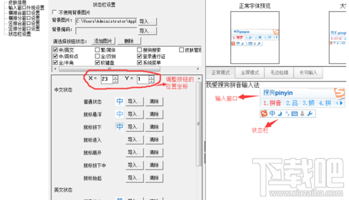 9、状态栏设置:首先导入背景图片,然后在“请选择按钮状态”中选择你想要在状态栏上显示的按钮,然后在中文状态和英文状态中导入你所设计的这些按钮的图片,并调整按钮的位置坐标。
