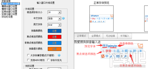 5、其次是输入窗口外观设置,在该设置项可以设置输入字时输入法窗口上所显示字体的大小、字体、颜色等,可根据设置项的意思自行设置。
