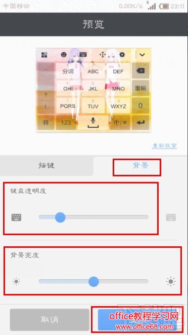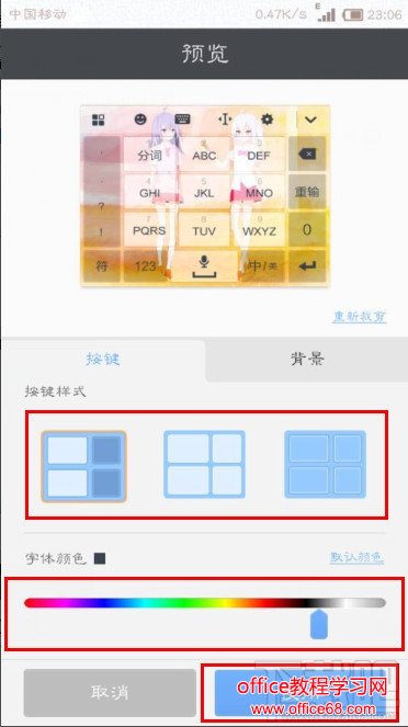 3、选择好自己想要设置为皮肤的图片,然后我们可以调整一下按键中的字体颜色和按键样式,调整一下背景选择自己想要的透明度以及背景的亮度