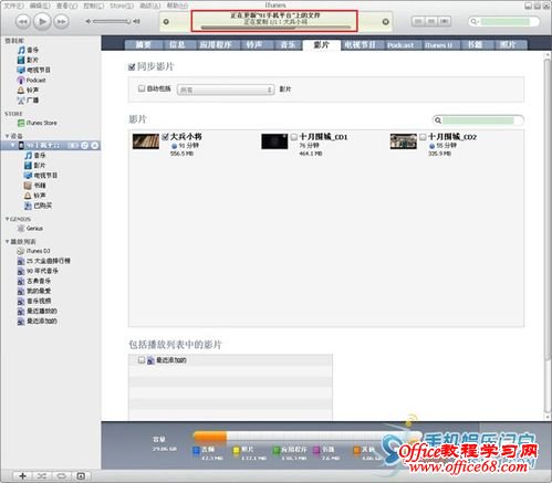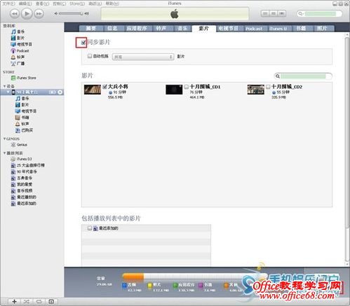 第五,导入完成后,在左侧设备栏目中,选择iPhone,并点击右侧的“影片”选项卡,在“同步影片”操作页面中,可以看到“同步影片”栏目下有已经导入到 iTunes影片数据库的电影文件,此时勾选“同步影片”并勾选欲同步到iPhone的电影,然后点击右下角的“应用”按钮即可。