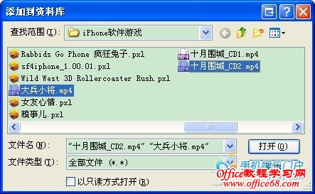 第四,笔者在这里选择的是“将文件添加到资料库”这个选项,在弹出的文件选取对话框中,可以安装键盘上的ctrl键或者shift键来选中一个或多个的电影(视频)文件。选中后,点击“确定”按钮,即可将文件导入到iTunes影片资料库中。