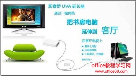 作为Windows为了解决运行复杂任务的工具诞生的扩展屏幕,现在已经有了更好的用途:现在家庭多媒体和液晶电视几乎都有VGA和HDMI接口, 为了可以很方便地连接到电脑上,把电视当显示器用。试想一下,要是把显卡的另外一个输出接到大屏幕液晶电视上,用液晶电视,而不是显示器来观看网上的高清 节目,或者玩电脑游戏,那有多爽。你可以在电视上看电脑里或网上的电影,电脑同时还可以做其他事情。如果电脑和电视之间的距离不超过3米,可以直接通过 VGA线或HDMI线将电视连接到电脑上使用。如果距离超过5米,由于信号的衰减,直接用VGA线或HDMI线连接有困难,这时你可以用影音桥 UVA延长器,把书房电脑的图像、声音、USB等延伸并接到客厅电视上,我们就可以在电视上玩电脑了。