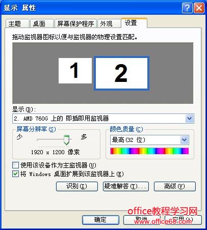 其实双屏显示的设置非常简单,因为Windows本身就支持这种设置,所以,在你把两个显示器都接好后,启动你的电脑,在Windows的显示属性-设置页面里,就会看到有两个显示器的图示,如下图所示。