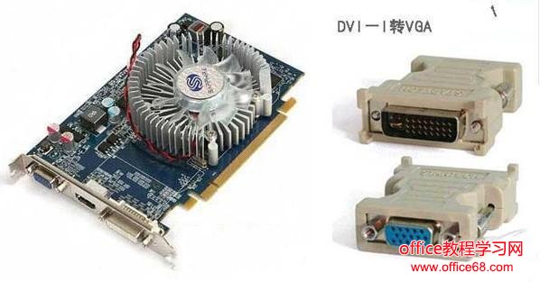 双屏显示就是利用一个双头输出的显卡接两个显示器。现在的显卡几乎都是双头输出,一个VGA一个 DVI、两个DVI或者是一个DVI一个HDMI。接一个显示器时,只用VGA或DVI(根据显示器的接口类型不同),接双显示器时,将两个显示器分别 接到显卡的VGA和DVI上,若显示器无DVI输入,可以 用DVI转VGA转接头,将显卡的DVI转为VGA,如下图所示。