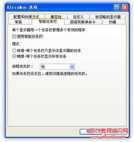 如图,在UltraMon的选项设置页的“智能任务栏”中,勾选“使用智能任务栏”和“镜像-每个任务栏显示所有任务”。