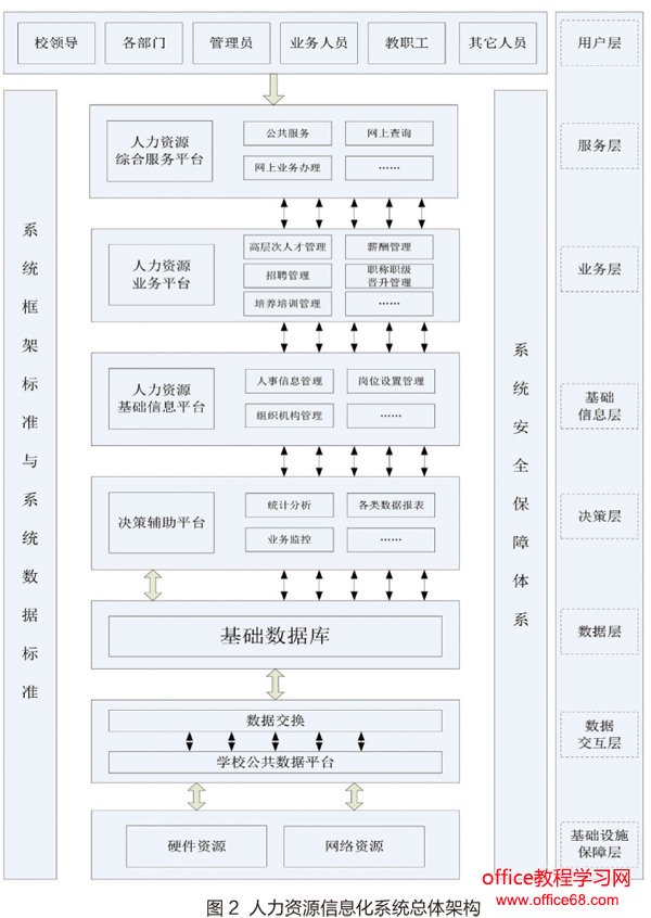 人力资源信息化系统总体架构设计 人力资源信息化系统建设将由多系统平台、多模块构成,采用模块与数据库相结合的方式建设,并集成于统一的平台,同时对平台配合安全保障体系,系统架构如图2所示。