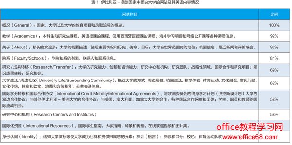 笔者还根据Webometrics项目的资料分析了伊比利亚-美洲地区的100所排名靠前大学和最著名大学的网站。在这100个网站中,26个包含有英语内容。表1展示了发布的英语内容栏目和提供相应栏目的大学占比,按照大学占比降序排列。