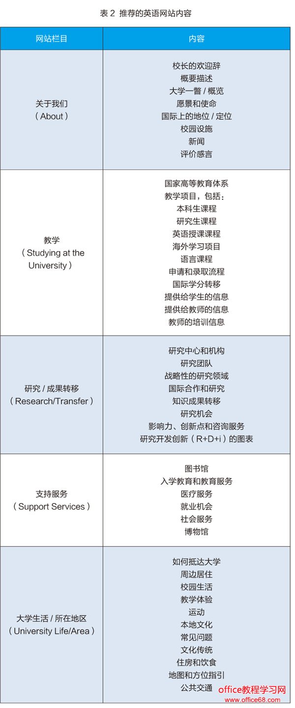 3.确保无障碍性 宾夕法尼亚大学(The University of Pennsylvania)的网站提供了满足网站内容无障碍指南(Web Content AccessibilityGuidelines,WCAG2.0)的窍门: 保持全网站导航一致;用户应当随时可以轻易地返回首页和其他主要的导航点; 将信息划分为明确定义的栏目; 在页面头(Page Headers)、菜单标签(Menu Labels)和页面地址(Web Address)上使用符合逻辑的命名规范; 确保所有的图片都包含有替代标记(ALT tag)以及宽高信息,以便将视觉信息的存在和内容告知给那些使用屏幕阅读软件的视觉障碍用户; 提供网站所有者的联系信息; 使用描述性语言来设置链接,而不是简单的“点击此处”,这样在脱离上下文时仍有意义; 理解和重视搜索能力和搜索引擎优化的重要性。 4.选用专业的翻译 如果高校决定要用另一种语言来提供网站内容,选用以此语言为母语的译员来翻译是很重要的,因为国际高等教育界是教育水平很高的受众。 同样,尽管英语是国际合作的通用语言,高校也可以提供其他语种的网站内容,如法语、汉语、葡萄牙语、德语,这取决于高校的地理位置和目标受众。 5.聚焦于关键栏目内容 最后,高校应当确保网站用英语(以及可能其他语言)为国际受众提供五个关键栏目:关于我们、教学、研究/成果转移、支持服务、大学生活/所在地区。表2展示了为每个栏目推荐的标准内容。