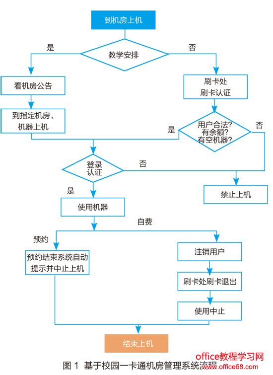 随着高校招生规模的不断提高,高校对计算机课程的重视程度也在不断提高,计算机机房的需求量在不断增加。计算机机房由传统的封闭式、小规模、单一模式,向开放式、大规模、智能化方向发展。传统的机房管理运行模式已经不再符合当今高校对机房管理的要求,建立一套完善的数字化机房管理系统是当今高校发展的必然趋势,而智能化的管理是这一趋势的风向标。随着校园的数字化、智能化发展,现在的高校都建有较完善的“校园一卡通”系统,校园一卡通系统利用RFID技术(射频识别技术),结合统一身份认证,实现电子支付、身份识别、信息查询等众多功能。将校园一卡通技术与机房管理系统相结合,可简化学生上机流程、提高机房管理效率、提高计算机使用率。 系统设计与分析 现在高校机房大多采用传统的人工值守方式进行机房的日常管理,传统的管理方式由于管理人员工作量大,管理效率较低,程序复杂,已经不适用于在当今校园智慧化快速发展的大环境。基于校园一卡通技术的机房管理系统可以有效解决以上问题,真正做到:1.实现无人化管理。机房管理实现无人值守,系统自动识别上机学生身份,自动分配机房和机器,并登记上机学生身份。2.自动计费。取消人工计费模式,实现系统自动对学生上机机时进行计费,并根据不同上机类型进行计费。3.实现无现金交易。校园一卡通的加入可以实现上机费用自动结算,全程无现金交易,并自动记账登记。 机房上机流程 传统的机房上机流程为: 1.学生开户,并向自己的上机账号进行充值。2.机房管理员分配机器。3.学生输入账号密码进行上机登录。4.下机注销账户。5.毕业时退还学生充值金额并注销账号。 而在采用基于校园一卡通技术的的机房管理系统中,全程无需机房管理员值守,学生可自助进行上下机操作,流程为:1.学生刷卡上机,系统自动分配机器。2.学生输入账号密码进行登录。3.学生刷卡下机,系统从卡中扣除上机金额。系统流程图如1所示。
