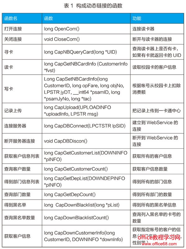 系统平台 本系统服务器采用Windows Server2008,客户机操作系统为Windows7,开发平台使用WebService,MFC7的支持库。 系统实现 校园一卡通与机房管理系统对接 结合大连工业大学的实际情况,本次对接工作采用合作公司开发的校园一卡通系统+与大连工业大学机房管理系统进行对接,具体操作过程如下: 1.安装触摸一体式刷卡机。根据机房的实际用途、学校上机实验安排,考虑学生上机便利性以及地理位置分布情况来布置刷卡机的安装位置。结合本校机房的实际情况,两台刷卡机均安装在机房入口处。 2.将校园一卡通刷卡终端安装到专用刷卡机内部的卡槽上,刷卡机设置2路接口,其中一路与一卡通管理系统服务器相连,用以实现用户名单导入、信息同步等功能。另一路与机房管理系统连接,用以实现机房管理系统对IC卡内数据的读写。 3.调试读卡器进行巡卡与读写卡操作。具体过程为:调用OpenCom接口连接读卡器,然后调用CapNBQueryCard寻卡(循环调用CapNBQueryCard直到寻到卡为止),寻到卡后即可调用CapGetNBCardInfo或CapSetNBCardInfo进行读写卡,使用完成后调用CloseCom断开连接。 4.连接读卡器与一卡通服务器。调用CapDBConnect连接到一卡通的WebService,然后进行数据的下载和上传,使用完成后调用CapDBDiscon断开连接。下载数据时,先获取信息数量(CapGetDepCount、CapGetCustomerCount、CapDownBlacklistCount),然后根据数量分配合适的空间,之后调用获取全部信息的方法获取信息(CapGetDepList、CapGetCustomerList、CapDownBlacklist)。 5.配置机房管理系统参数,设置计费方式,扣款方式。 构成动态链接的函数参见表1。