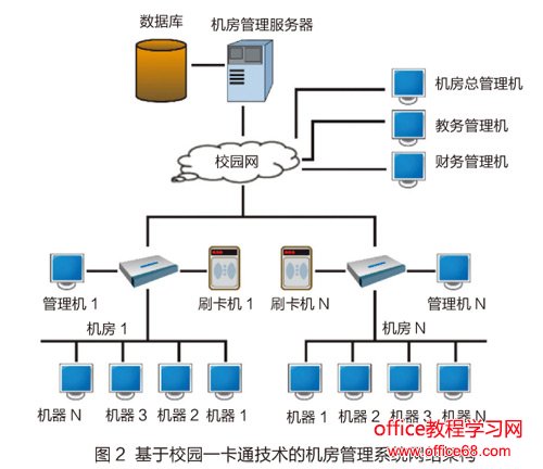 网络拓扑图 本系统建立在校园局域网之上,采用B/S和C/S相结合的方式,基于校园一卡通的机房管理系统网络构架如图2所示。