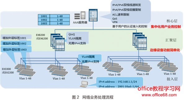 1.当来自机构B的用户在机构A连接无线网时,发起Eduroam网络认证请求,机构B用户的认证信息含有机构B的域名通过无线AP发送到Authenticator,启动802.1x认证过程。 2.交换机将请求信息发送到机构A认证服务器,对认证信息进行判断,将认证请求转发到联盟级认证服务器以及顶级认证服务器,对访问请求信息进行判断,如果@机构B域名属于联盟用户,转发到机构B认证服务器。 3.机构B认证服务器对请求进行认证,认证完毕将认证信息通过Radius代理服务器转发回机构A认证服务器。 4.机构A将结果转发到Authenticator。Authenticator对机构B用户授权无线网络。 使用特色 访问学者和访问学生日渐增加,国际国内相互间交流非常频繁,学校交换生数量逐年递增,校内师生国内外开会学习时使用网络的需求也在日益增加,部署Eduroam无线漫游认证可以很好的解决以上问题,同时,我们学校根据学校实际情况,为更好地实现网络安全和审计,搭建了扁平化网络架构。 扁平化网络架构设计 当前很多学校网络采用三层网络架构,即接入-汇聚-核心。接入至汇聚为二层链路,汇聚至核心为三层链路,为了确保终端用户的安全接入以及网络的稳定运行,往往在接入与汇聚设备上部署特别多的完全策略,并且尽可能地简化核心的配置,确保核心高速转发流量(包括正常流量、异常攻击流量、非法接入的流量)。同时,校园网采用上述粗放型的网络架构设计,网络仍然存在无法实现差异化服务,简单互通,无法针对不同群体用户实现不同的服务;用户之间互相影响,网络中的攻击泛滥;无序使用,访问过程没有完整的记录、审计和基于用户的控制等诸多问题。 结合上述问题,经过多方调研和探讨,决定采用扁平化网络架构设计来解决传统校园网的问题。全新的网络业务处理流程如图2所示,可以很好地定位和溯源网络用户,解决了安全审计等问题。