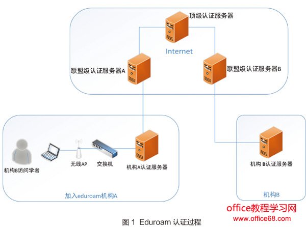 Eduroam的实现,很好地解决了高校教育机构之间跨区域学术交流,所有已加入Eduroam联盟的机构,用户可以使用原单位提供的网络账号,在全球范围内连接已加入Eduroam机构的无线网络。Eduroam很好地满足了授权用户在成员教育机构可以安全畅享无线网络,从而减轻了访问高校网络的工作,提高了各项办事效率。目前,欧美国家和日本几乎所有大学都是Eduroam成员,我国的跨域无线漫游技术还处于发展阶段,但是随着国内外高校的交流增多,提供便利的网络接入、加入Eduroam联盟将是大势所趋。 认证机制 Eduroam是由欧洲研究与教育协会提出的,一种应用了802.1x协议的专为研究和教育机构开发的国际无线漫游接入认证服务。Eduroam认证机制是在全球范围内为加入的机构建立了Radius代理服务器的树形结构,该架构主要包括下面几部分:顶级认证服务器(TLR)、联盟级的认证服务器(FLRS)、校园级认证服务器、级联认证服务器、身份管理系统。用户在连接到访机构的无线网络时,身份认证信息将从到访机构的认证服务器通过上述的树形架构传送用户认证信息到所在机构的认证服务器中进行身份的识别。具体认证过程如图1所示。