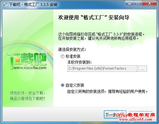 格式工厂(Format Factory)是一款多功能的多媒体格式转换软件,适用于Windows。平时我们在看视频,听歌的时候。有时下载下来的音乐,软件老是打不开,显示格式错误的提示。不知道去哪里弄,知道有格式工厂,却不知道怎么装,不用着急,下面就让我来演示怎么安装格式工厂给你们看。 环境:格式工厂软件,windows操纵系统。 安装格式工厂软件: 1:双击格式工厂软件,显示如下,其中个人建议的“自定义安装”,因为“标准安装”安装在C盘上,如果你下次重装系统的时候,它就会把你清除了。还有一般安装软件我们都不建议安装在主盘,会给电脑带来很卡。不利于电脑运行。