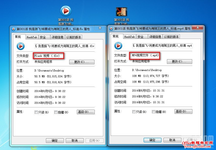 5:flv转换MP4格式后,两个文件进行对比。可以看到文件类型已经改变了格式了。这就是flv转换MP4格式。