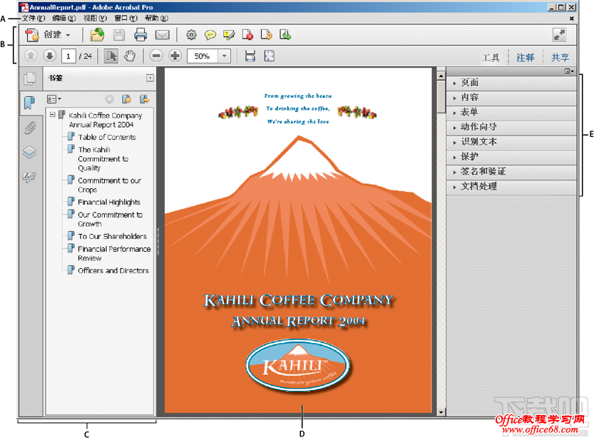 A. 菜单栏B. 工具栏C. 导览窗格(已显示书签面板)D. 文档窗格E. 任务窗格