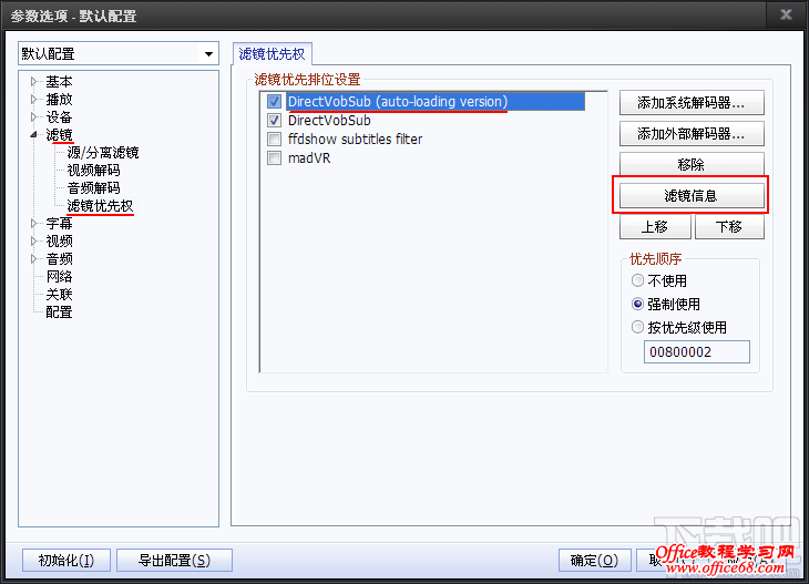 4、在“滤镜”-“滤镜优先权”设置页里,选择“DirectVobSub (auto-loding version)”或“DirectVobSub”,然后点击“滤镜信息”按钮,可以打开VSFilter设置界面