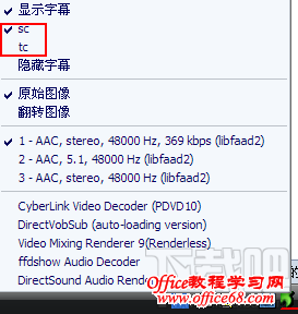 5、打开一个有字幕的视频,如果右下角出现一个绿色箭头的图标,则表示调用VSFilter插件成功 您在播放有多语言字幕视频时,可以用右键点击绿色箭头的图标,切换所需语言字幕。