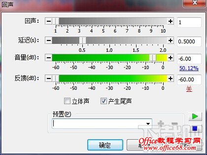 面板最上行设置回音的次数,就是说你想让产生几次回音。 第二行是设置延迟时间,单位是秒。就是设置回音与主音或两次回音之间的间隔。 第三行音量是指回音的衰减量,以分贝为单位。 第四行反馈是指回音对主音的影响,-60db即为关闭,就是对主音没有影响。 选中“立体声”选项可产生双声道回音效果,选中“产生尾音”可让回音尾部延长。但注意你的声音后面要有足够的空白时间以适应尾音的延长,如果结束处没有空白时间,可按第一节讲的方法插入静音时间。 以上各项选择什么值合适,你可通过多次试验决定。试一次听听效果,如果不合适就从编辑菜单下选择“撤消回音”,然后再做。 如果回音的衰减量选择为0db(就是不衰减),可以得到二重唱的效果。如果延迟时间选择0.02秒以下,可以听到二人合唱的效果。 |