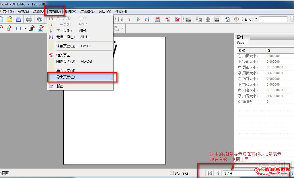 导出Foxit PDF Editor的PDF部分内容,我们有时只需要中间一些部分的PDF就行的。所以要在里面怎么导出一部份文件出来,下面就让我给大家演示一下,怎么导出Foxit PDF Editor的PDF部分内容。 导出Foxit PDF Editor的PDF部分内容: 1:打开“文档”--“导出页面”。这里是四张页面的,右下角有解释。 1: 2:根据格式,选择你要的页面,记得这里是英文的逗号。
