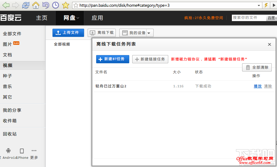 6:百度盘的离线里添加BT种子,离线好,可以播放了哦,哈哈,真爽!